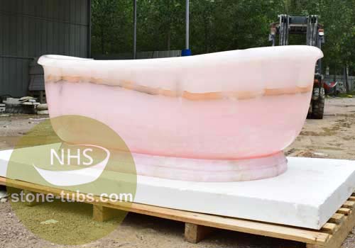 Usually onyx materials have high water absorption which means the onyx is fragile and easily been stained, however, this pink onyx has a lower water absorption compared with the other onyx materials. So it’s good for interior decoration, especially for bathtub which will be used in moist environment. But the surface still needs to be sealed by waterproof coating. Usually we protect the Rose pinks onyx bathtub surface by waxing after brushing 3 layers waterproof coating.