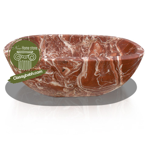 This freestanding marble tub looks like an elegant flower, sitting pretty in a space. Its simple design can pop owing to its powerful color and pattern. This marble bath has a bold natural red hue that makes it stand out in even the most complex layouts. It has creamy burgundy, deep mahogany, calming beige and pure white hues blending together and creating a natural kaleidoscope. The sides of the tub are rigidly straight for structural reliability and the tub has thick rims around the edges. This hand-carved tub is destined to become the centerpiece of your bath space.