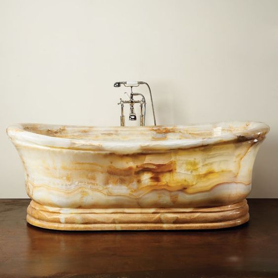 This is another gorgeous bathtub made out of onyx in a brownish hue. Since it is made from a stone that mimics a natural wood-like appearance, it seems as if this tub is made from a large piece of wood. But the truth is that this freestanding tub is the result of a stunning natural stone.