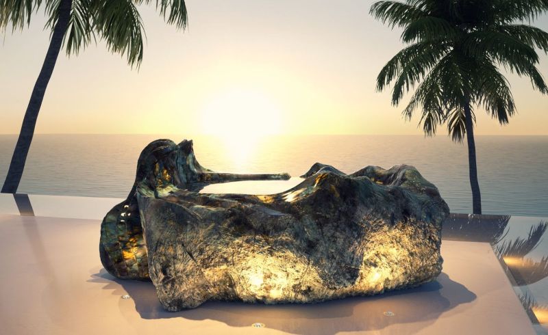 Created by Dutch sculptor Jan-Carel Koster, this three-person crystal and gemstone bath sculpture is crafted from around 18,000 kg block of Labradorite that was formed naturally billions of years ago. When you see it in natural light or artificial light, you can notice the flashes of green, blue, orange, and yellow hues with the diffraction of light.