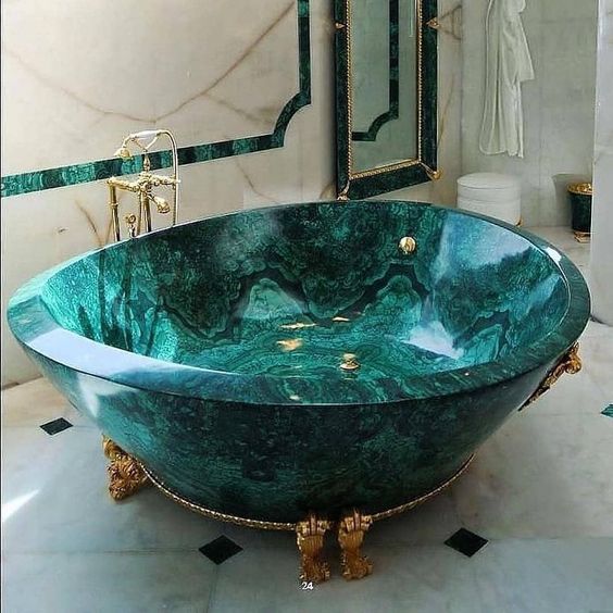 Hand sculpted and hand polished from a gorgeous green malachite gemstone block, this bathtub is another opulent piece to enhance the visual appeal of your luxury bathroom. Being an eye-catching gemstone installation, this stunning design of the tub is enhanced even more with the golden claws. It seems as if this tub has come out from a royal palace.